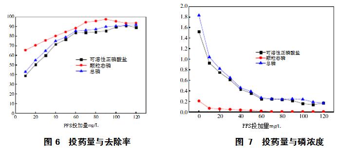聚合硫酸鐵不同投加量下上清液磷的去除率及濃度見圖6和圖7:
