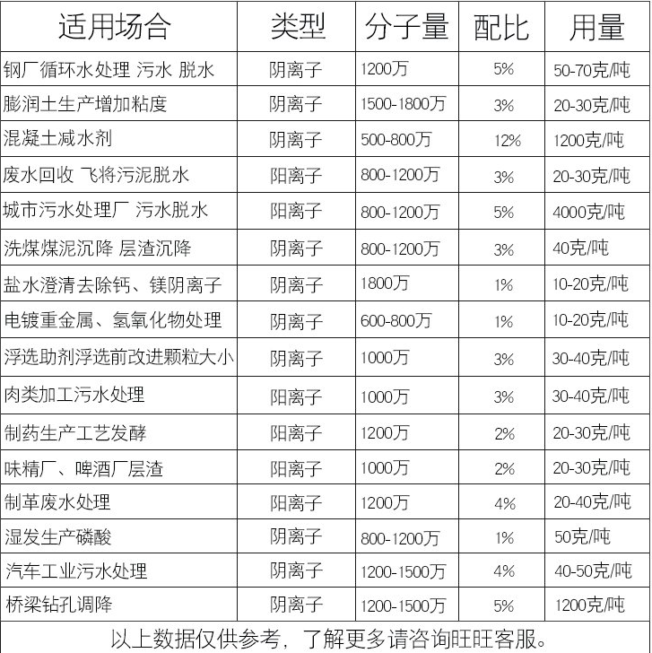 高粘水處理聚丙烯酰胺 陰離子絮凝劑pam,陰離子聚丙烯酰胺的適用比例如下圖: