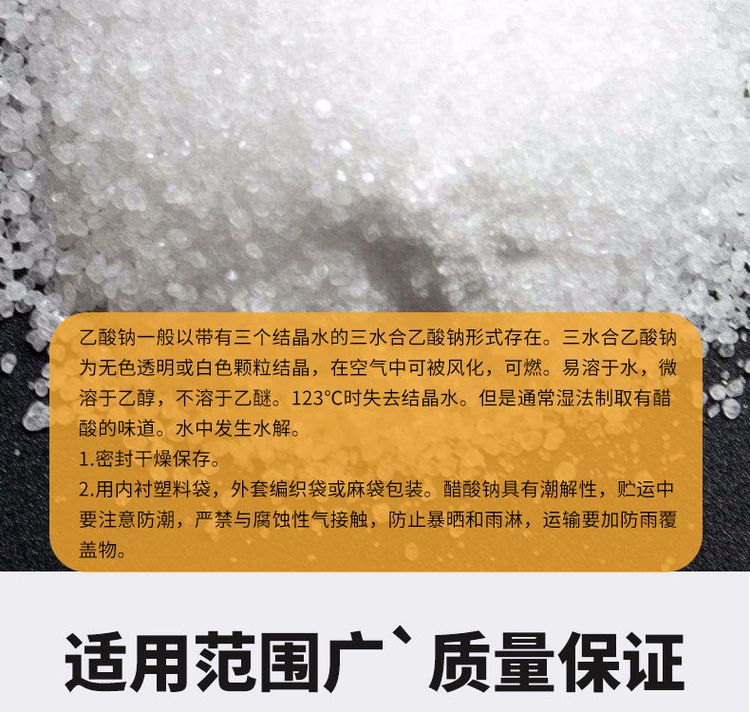 紡織廠污水處理乙酸鈉 無色透明晶體無水醋酸鈉,無色無味的結(jié)晶體,在空氣中可被風(fēng)化,可燃。易溶于水,微溶于乙醇,不溶于乙醚。123°C時失去結(jié)晶水。但是通常濕法制取的有醋酸的味道。水中發(fā)生水解。顯堿性。