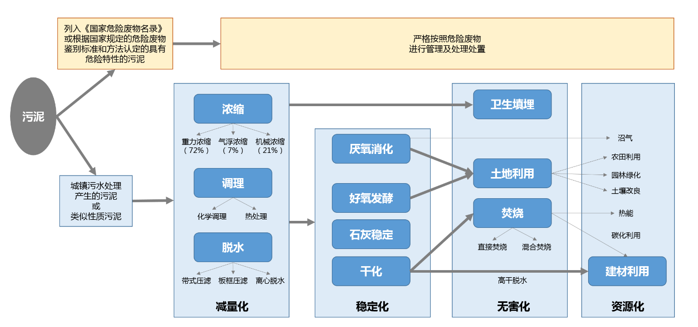 近年來,住建部、環(huán)境部等相關(guān)部門先后頒布了《城鎮(zhèn)污水處理廠污泥處理處置及污染防治技術(shù)政策(試行)》、《HJ-BAT-002城鎮(zhèn)污水處理廠污泥處理處置污染防治佳可行技術(shù)指南(試行)》、《城鎮(zhèn)污水處理廠污泥處理處置技術(shù)指南(試行)》等政策及指導(dǎo)文件,對(duì)污泥處理及處置給出了推薦路線。