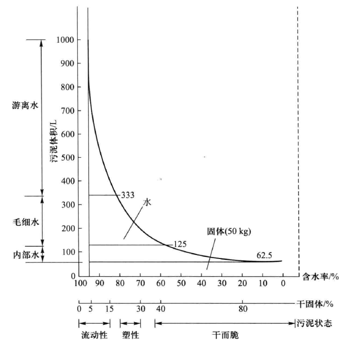 從污泥含水率與污泥狀態(tài)的關(guān)系圖可以看出,為了便于污泥處置時(shí)的運(yùn)輸,污泥要脫水,使含水率降至80% 以下,失去流態(tài)。通常,若污泥進(jìn)行填埋,其含水率要在60% 以下。
